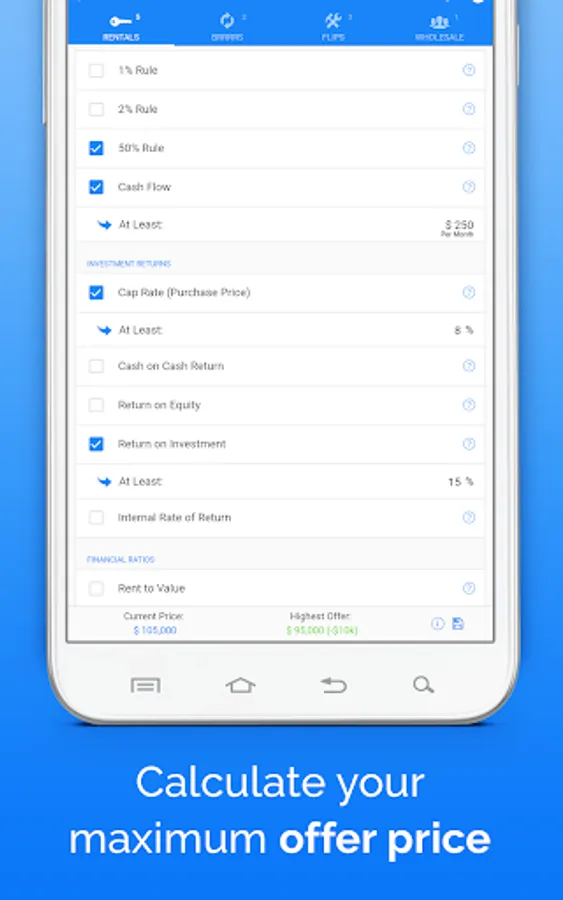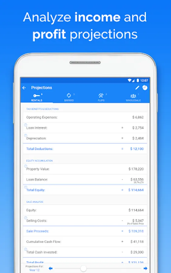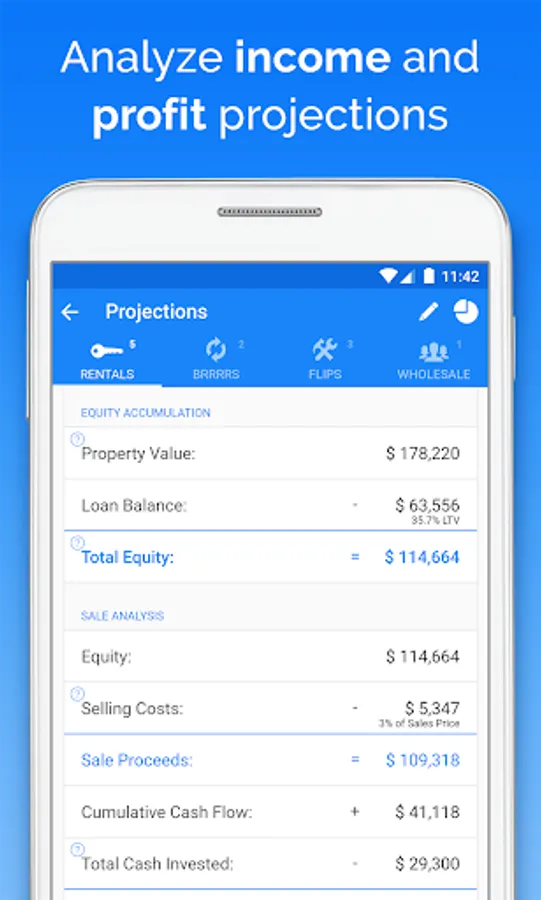 • Quickly vary your assumptions and view long term holding projections for rentals and profit projections for flips