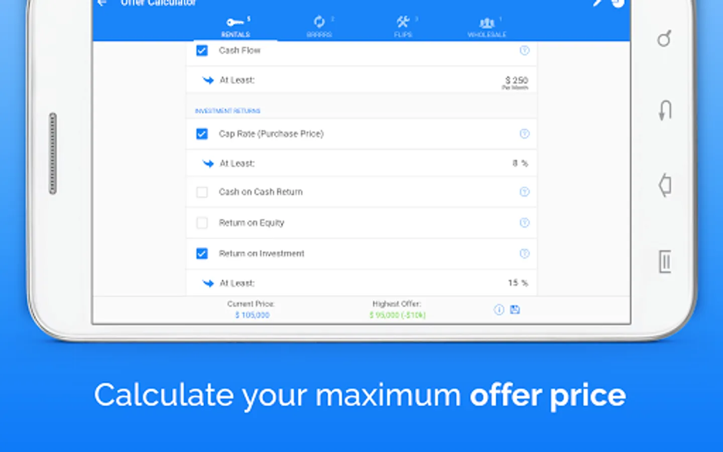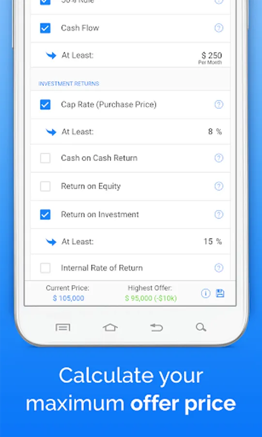 We are committed to keeping this the best real estate calculator for Android and regularly release new features. We'd love to include your suggestions in our next update - send us your ideas to support@dealcheck.io.