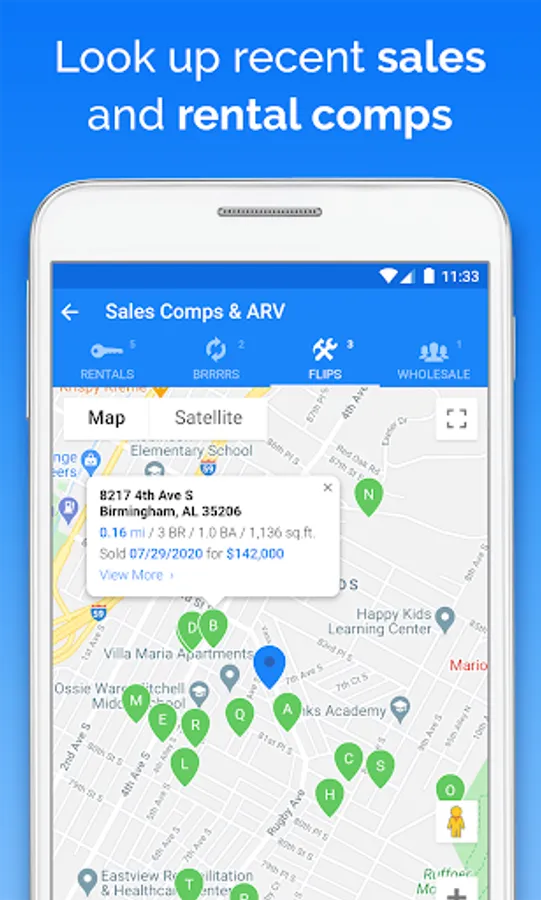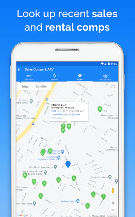 • Look up recent sales comps, comparable rental listings and market statistics to help you estimate after repair values (ARV) and rent
