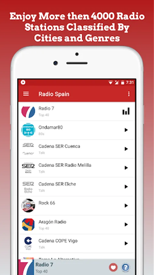 Spain Radio includes the most popular Spanish radio stations all together for faster, easier listening and for free. You can quickly enjoy your favourite Spain radios by various categories in one click, instant playback and premium quality.