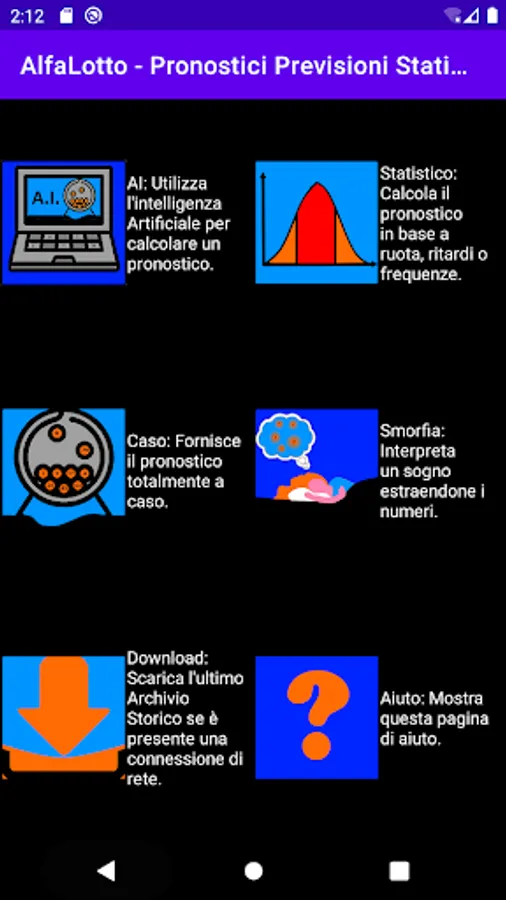 Alfa Lotto allows you to get predictions for the Game of Lotto, for SuperEnalotto, for 10 and Lotto Evening, for 10 and Lotto every 5 minutes and for the MillionDay based on: