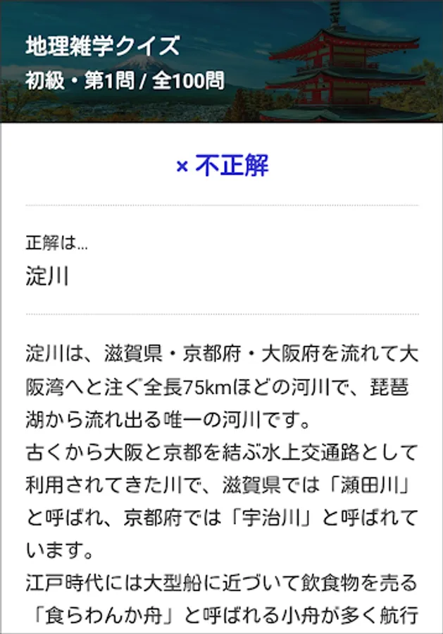 答え合わせ&解説画面にはWikipediaへのリンクが付いているので、気になった答えについては、すぐにより詳しく知ることが出来ます。