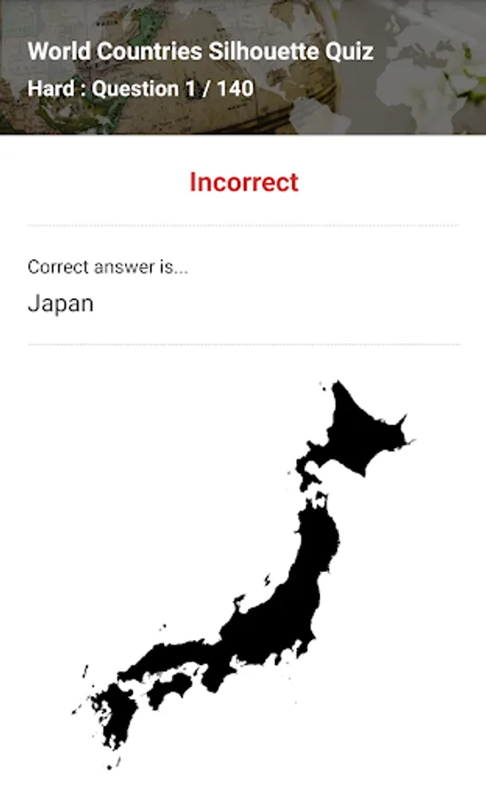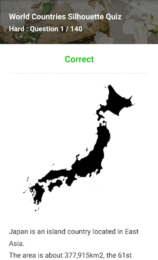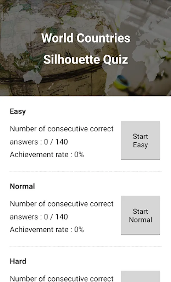 Because it is divided into easy, normal, and hard, you will learn the location, shape and name of the countries of the world naturally through the steps.