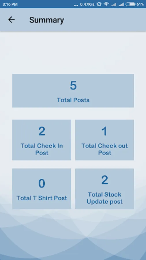 The first user downloads the app from android app store. Please note when you download the app then after you must to login into the app and login credentials provided by the admin. After login ADMIN see the dashboard screen that displays the details about Total posts, Total check in post, and Total check out post, Total T-shirt post or Total stock update post.