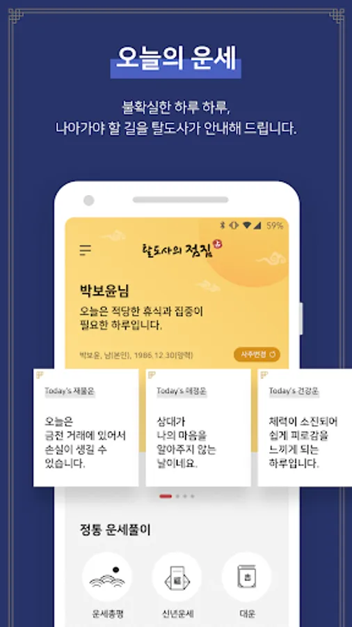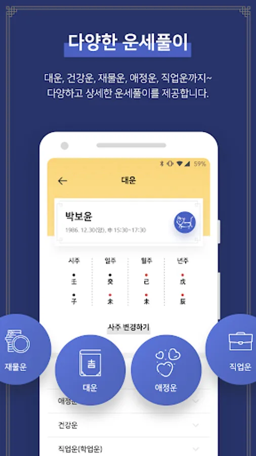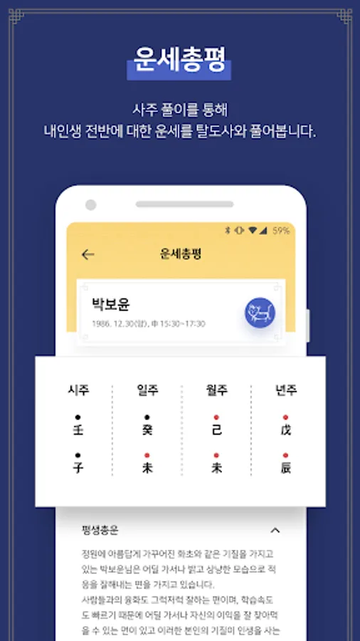 The fortune-telling review provides a fortune-telling service on personal characteristics and personality, growth process, academic and professional environment, spouse, and children's luck throughout life based on the Myeongrihak solution.