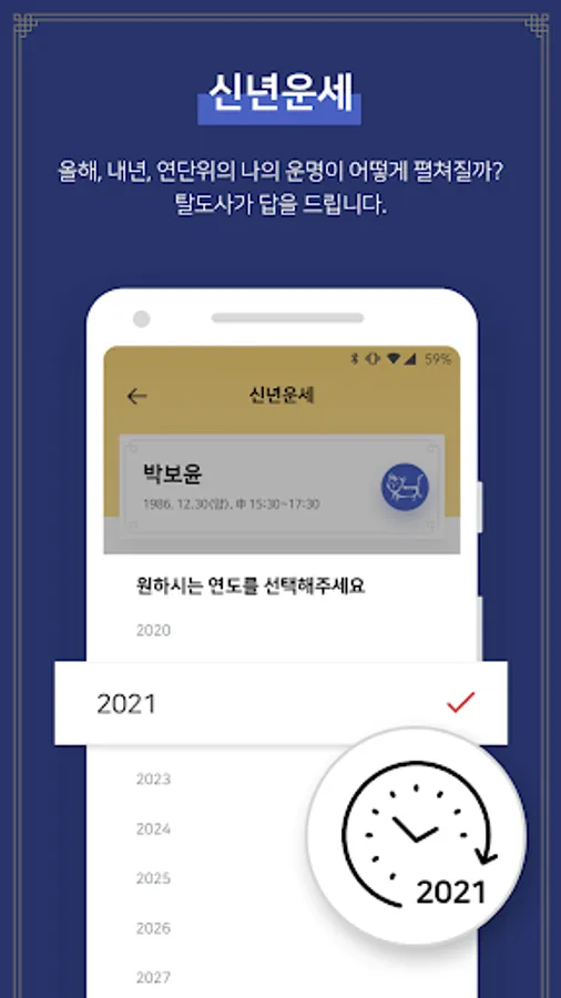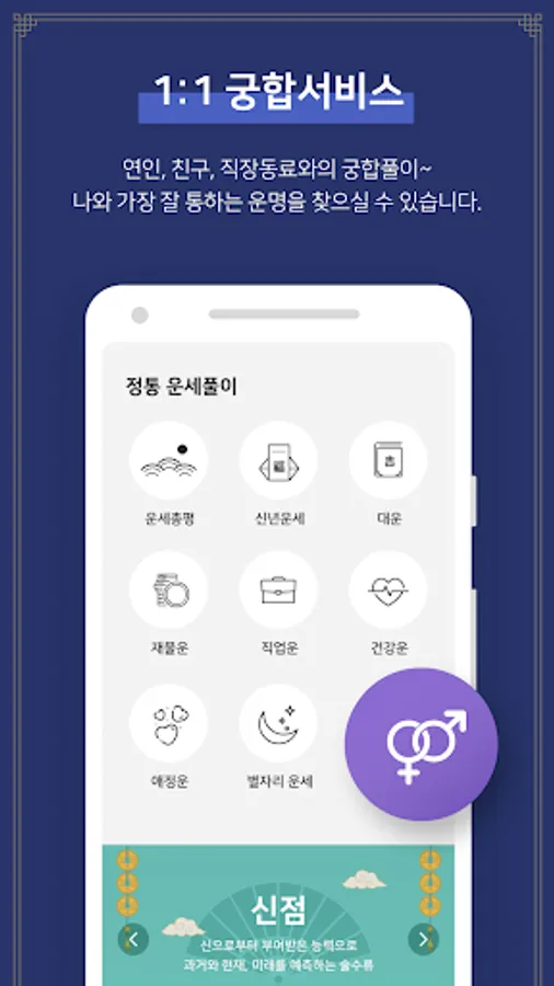 If you select the year's horoscope, the new year's horoscope, and the year you want to know as a yearly horoscope, various horoscopes for the individual in that year are solved. It provides a comprehensive review of new water, social environment, and personal activity environment, and provides a comprehensive solution for New Year's fortune telling and helps you to prepare or plan environmentally insufficient areas. Social activity environment provides a guide to social activity by analyzing changes in the environment or situation of a job. Personal activity environment helps to maintain a smooth relationship by analyzing in detail the surrounding environment of individuals such as spouse, lover, and children.