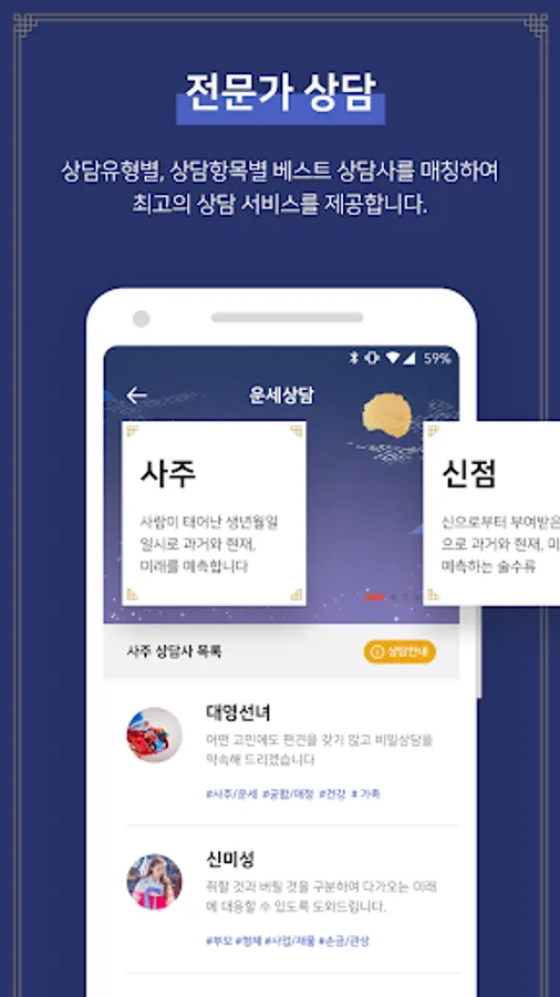 ※Based on other manipulatives such as four-week-old counselor based on Myungrihak, professional counselor for fortune-telling based on new store, tarot expert counselor through tarot cards, Kimundungap, Jamidoosu, Yukim, Taeeulsu, meditation, Fengshui, and Seongmyeonghak. You can receive premium fortune-telling counseling services by connecting with professional counselors.