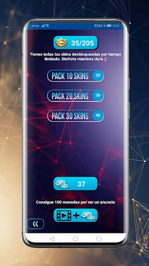 "Unlock Skins" allows you to unlock packages of skins with the coins obtained or add new coins by performing actions.