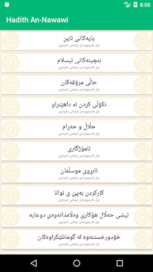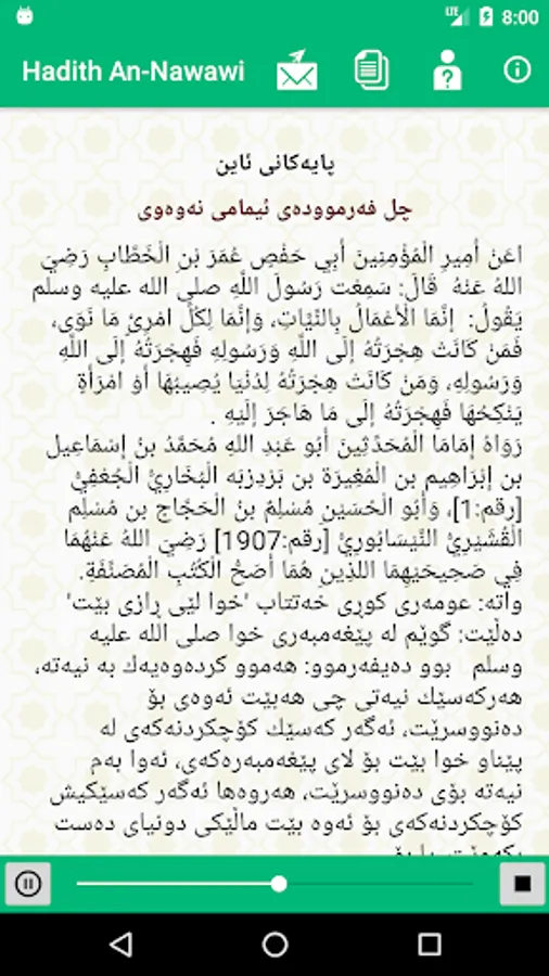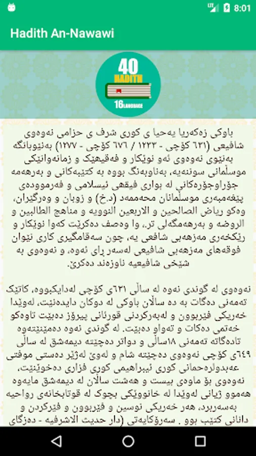 بەڕێزان ئەم ئەپە پێک دێت لە فەرموودەکانى ئیمامى نەوەوى کە ناسراوە بە ٤٠ فەرموودەکەى نەوەى