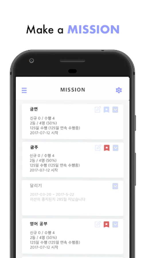 MISSION is where you register your goals and register your day-to-day doing. You are able to achieve the goals together with those who have the same goals (mission), and do happily. Do you have any goals or dreams that you have put off? Just write it down on MISSION now and check it every day. Then you can meet yourself and your friends who become happy in someday.