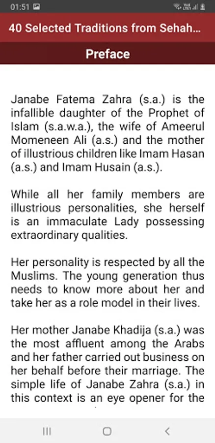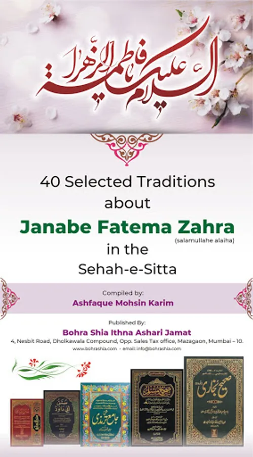 We are pleased to publish this book, “40 Selected Traditions about Janabe Fatema Zahra (s.a.) in the Sehah-e-Sitta” compiled by CA Ashfaque Mohsin Karim who is a qualified Chartered Accountant, Professor in college and a Management consultant. May Allah reward him and his parents.