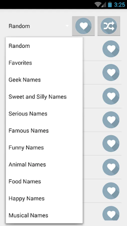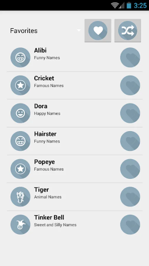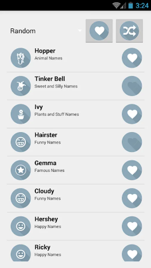 Let the app pick random names for you or choose between categories such as famous names, musical names, geeky names and pick your favorites for later decision.
