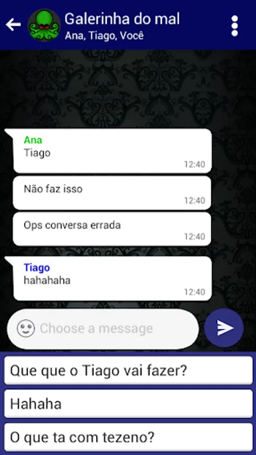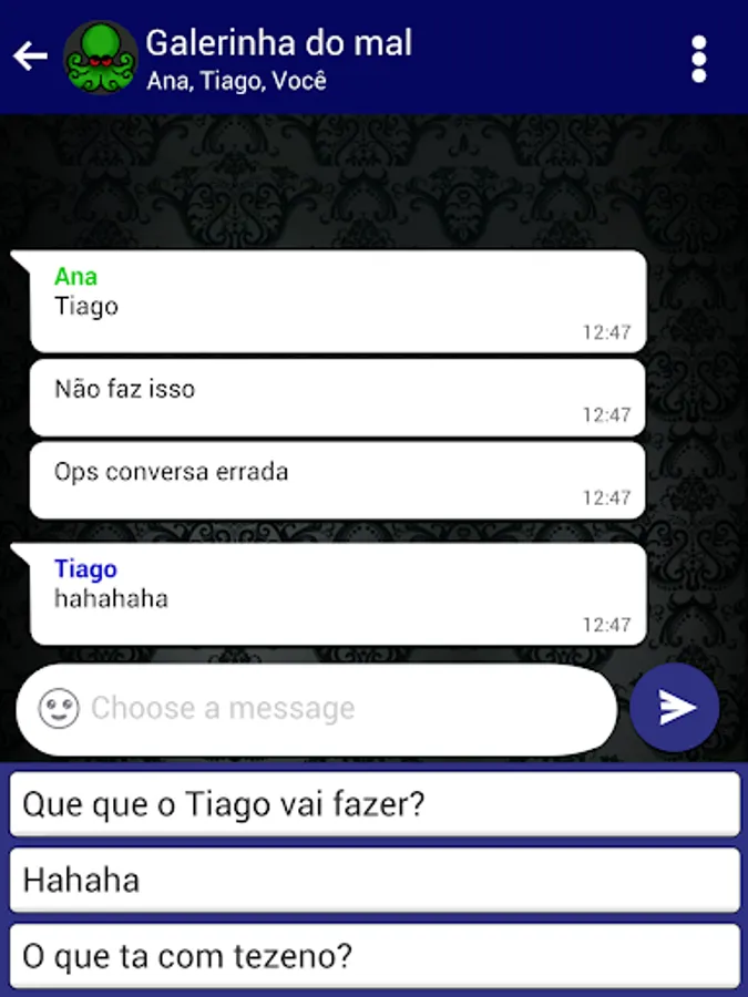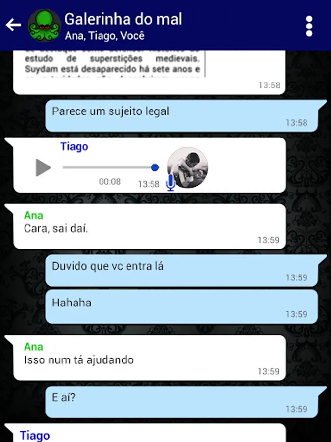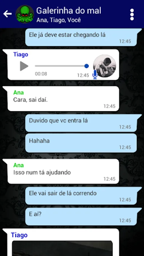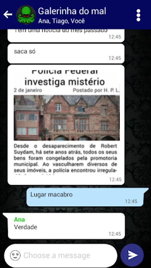 A horror game inspired by H. P. Lovecraft's tales told via an instant messaging group. Before the story of Last Message, James decides to make an urban exploration in an abandoned mansion may never come back from there. Talk to him and Ana in the group of "Evil Galley" to try to help his friend out of the nightmare where he entered without knowing.