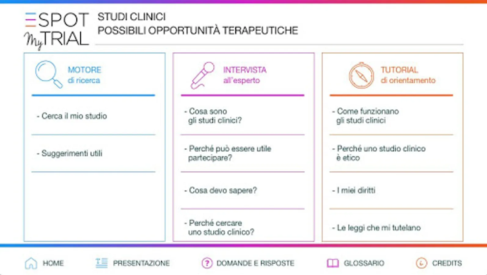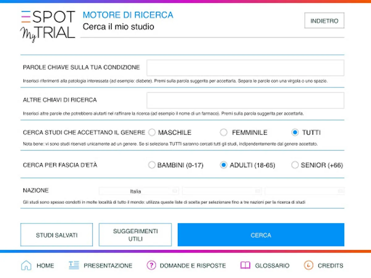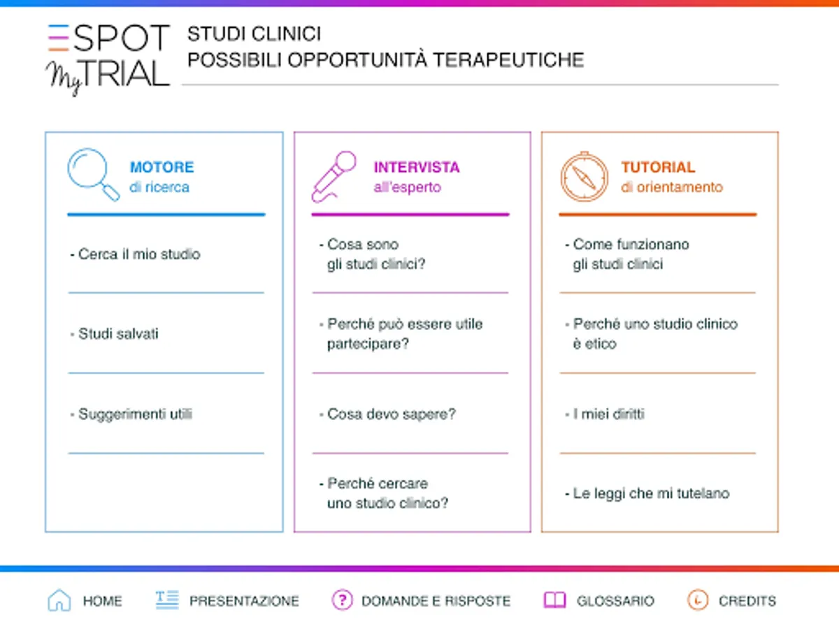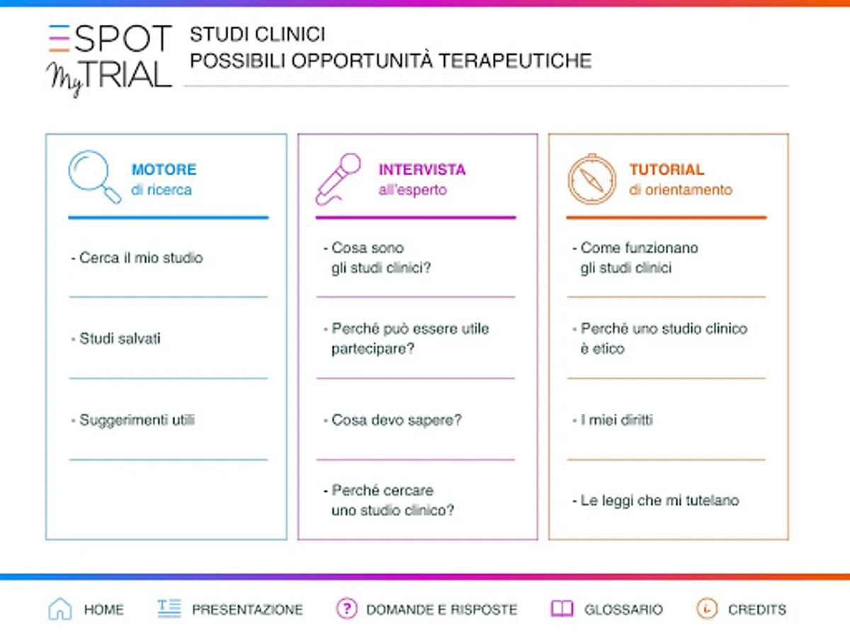 SPOTmyTRIAL born with a dual purpose: to help those who must assess the participation (or not) in a clinical trial orienting in this complex and delicate situation, and encourage, thanks to a real search engine, the identification of the clinical study it might be helpful to your needs.