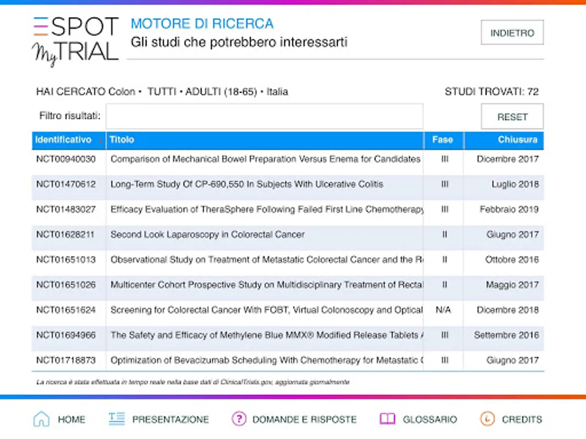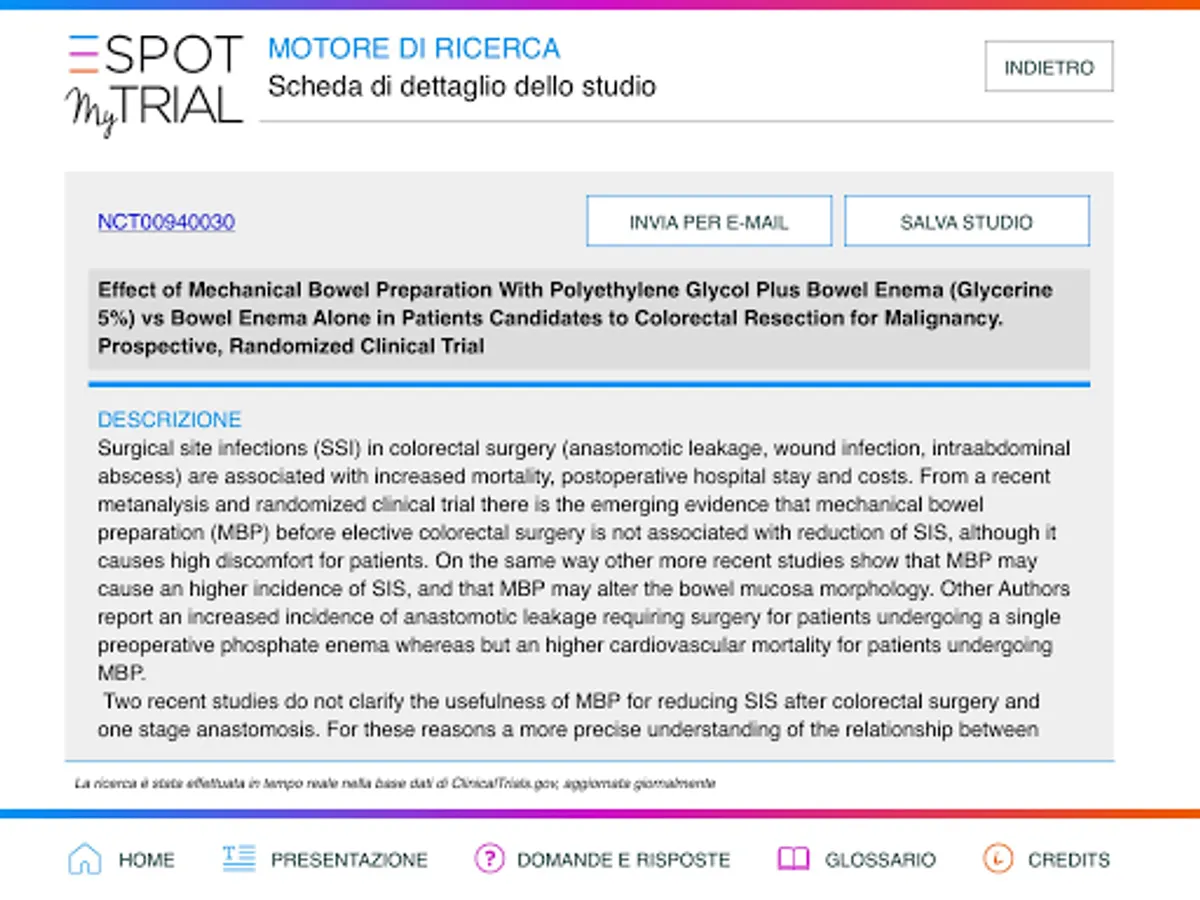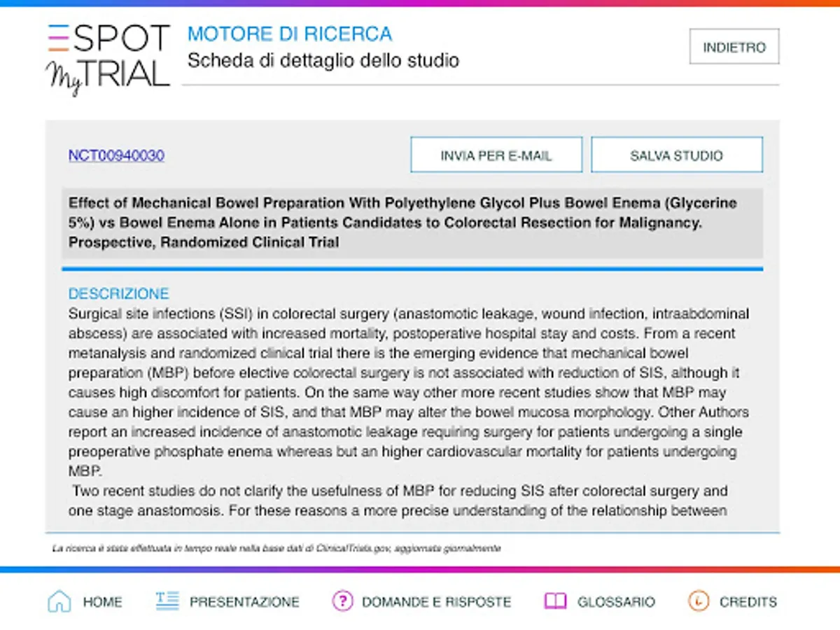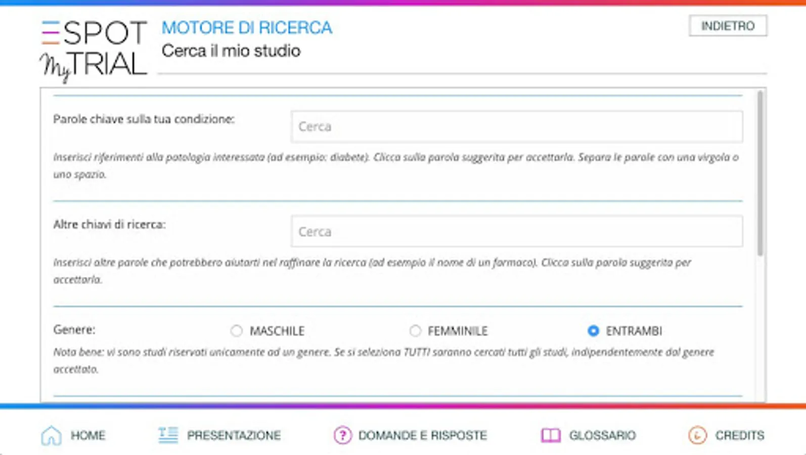 SPOTmyTRIAL born with a dual purpose: to help those who must assess the participation (or not) in a clinical trial orienting in this complex and delicate situation, and encourage, thanks to a real search engine, the identification of the clinical study it might be helpful to your needs.