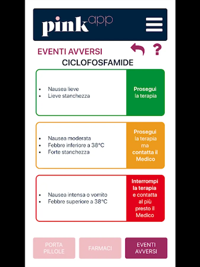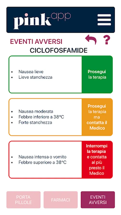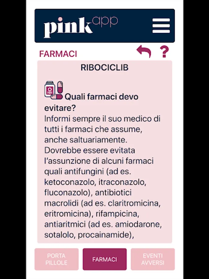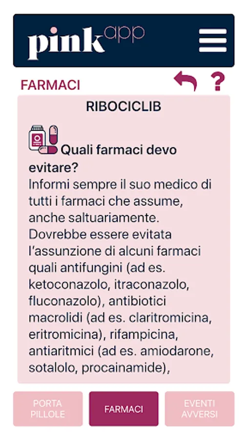 PinkApp addresses the patient who is following an oral therapy for the treatment of breast cancer. It contains useful information on how to behave in case of side effects and how to take the drug but above all it wants to be a tool to favor the compliance to the therapy prescribed by the treating doctor.