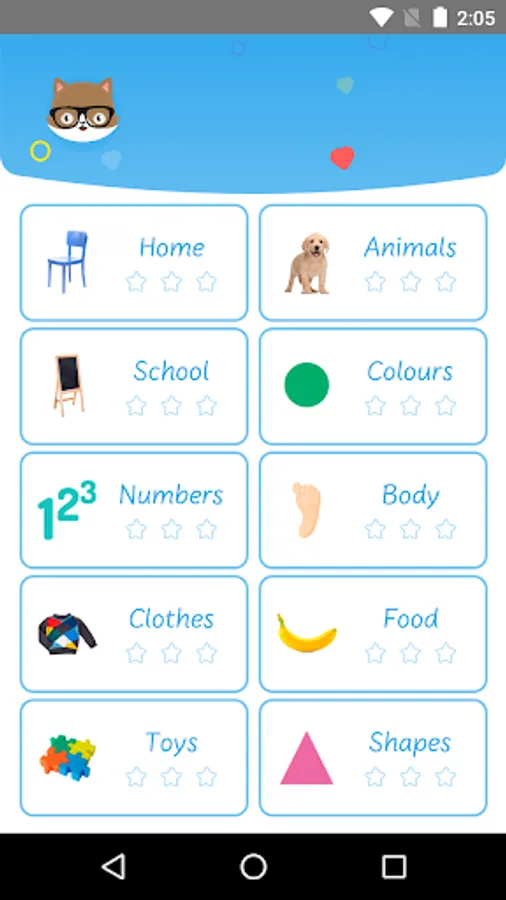 • 10 different topics: animals, colours, numbers, human body, school, clothes, food, shapes, toys, and household objects