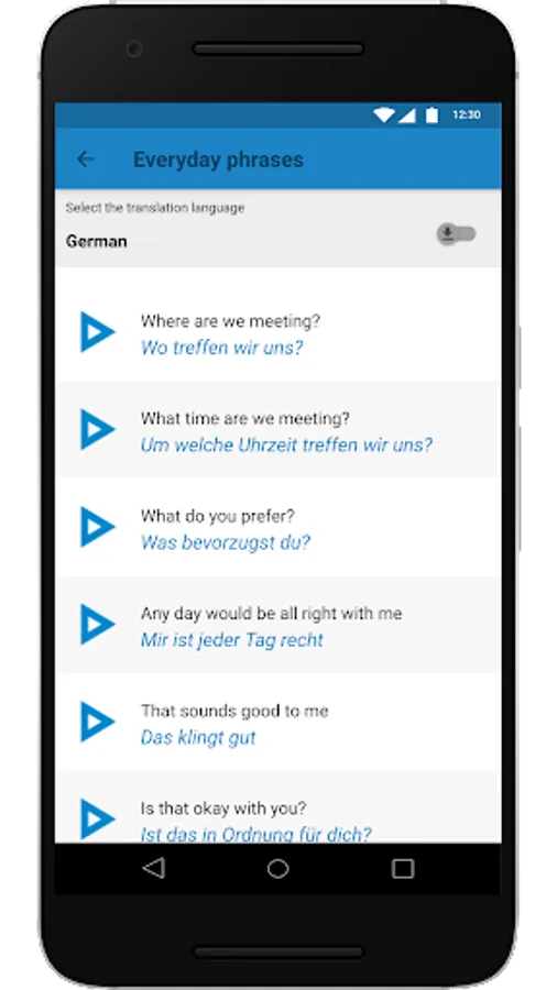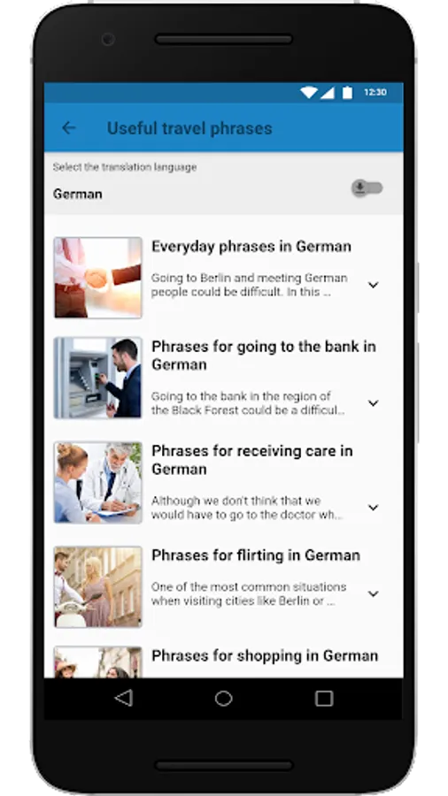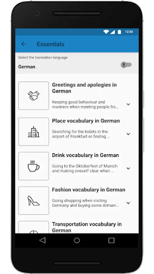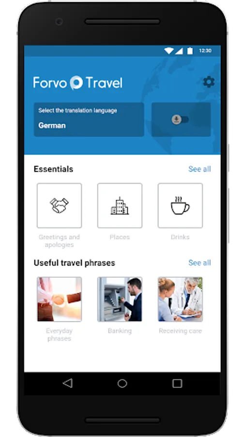 The content is presented in two sections: Essentials and Useful Travel Phrases, each containing different categories relevant for travel. In Essentials there is useful vocabulary for daily situations, while Useful Travel Phrases contains helpful phrases for particular situations.