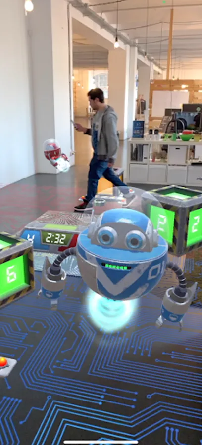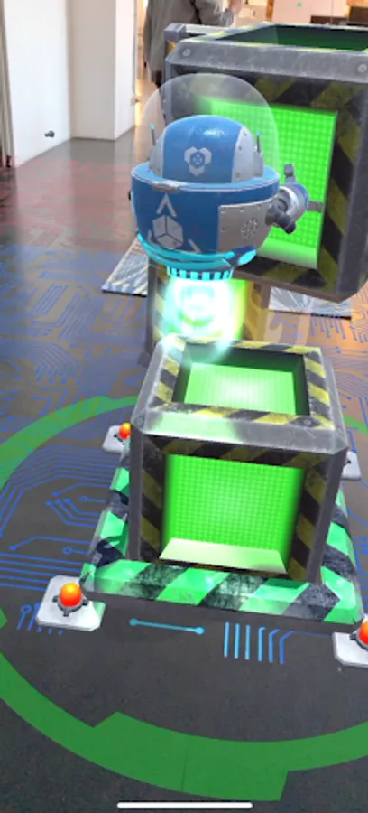 There are cubes that appear inside the play area and robots need to approach the cubes and collect them. This is done by users physically moving towards a cube and (the robot follows the movement) guide the robot close enough to the cube so the robot then picks it. Next the robot needs to bring the cube to a furnace (at the far side of his game area) and place it on the furnace doors. The player can choose to stack as many cubes on top of each other on the furnace door as they can (each cube is abit more than a foot high). The player can then tap a button and send the cubes into the furnace for melting, and this is how an Orb gets created.