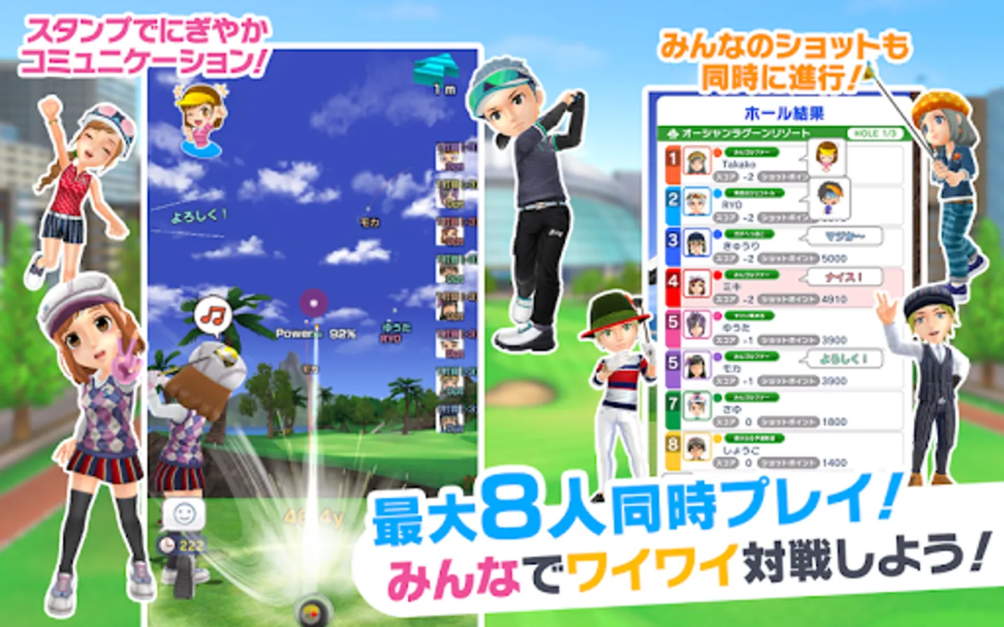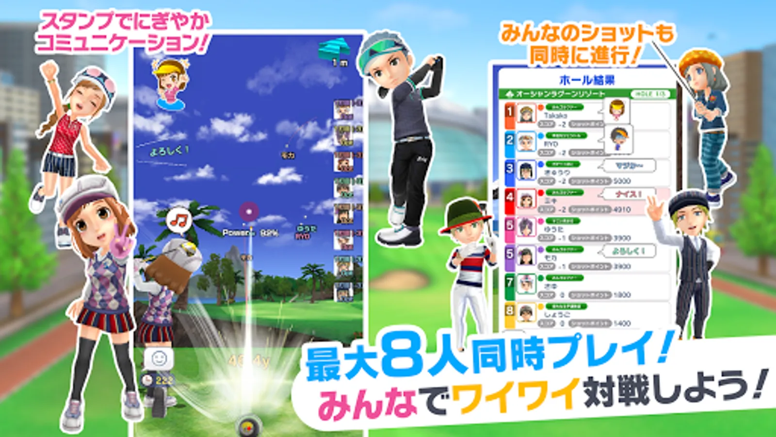 "Golf with everyone" can be played by up to 8 people at the same time! Compete with friends and players all over the country!