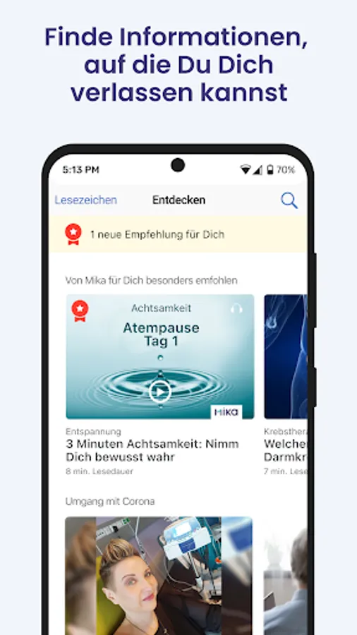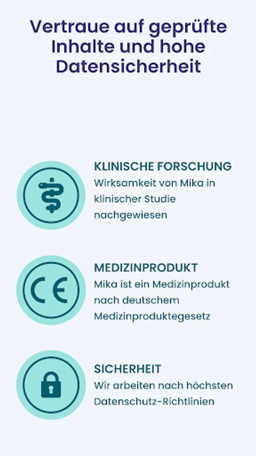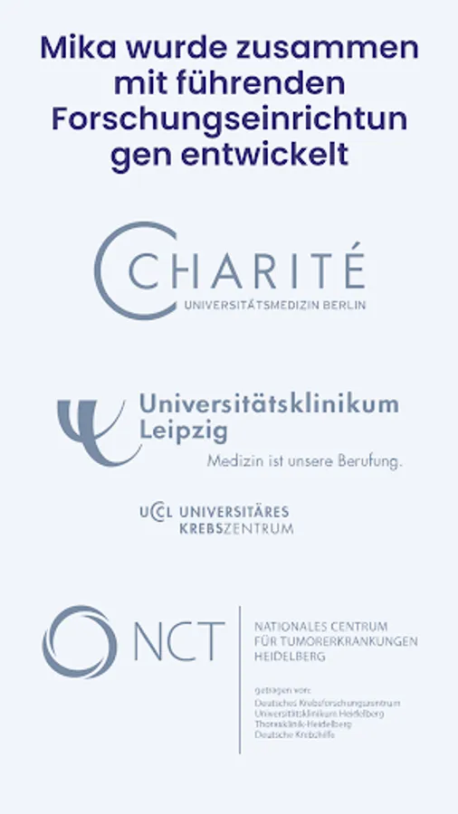 From yoga to nutrition to relaxation. From informed to motivated: The cancer app Mika accompanies you during and after cancer therapy. Observing symptoms, mindfulness and movement exercises, answers to difficult questions – Mika helps you to better cope with the mental and physical consequences of your illness. You can rely on qualified information and medical expertise: Mika is developed in close collaboration with leading oncologists, psycho-oncologists and cancer researchers at the Charité, the Leipzig University Hospital and the NCT Heidelberg. The Mika app is also a certified medical product according to MDR (Class IIa). This means that Mika has been thoroughly evaluated and meets the highest quality and safety standards.
