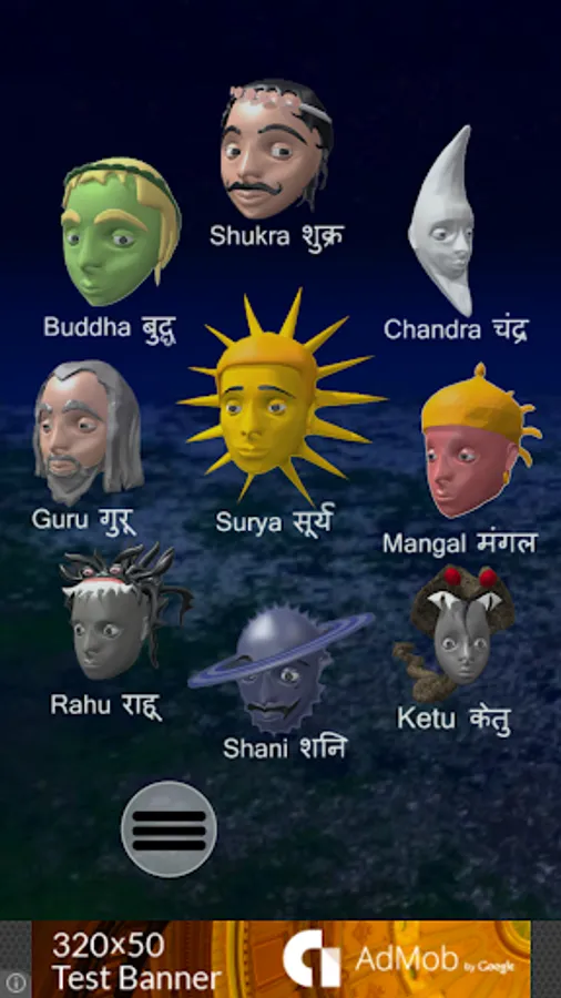 This app is a 3D depiction of the Navgrahas (the nine planets). It has nine scenes, each depicting a planet in cosmic space. You will have the ability to chant a unique mantra for each of these Navgrahas -