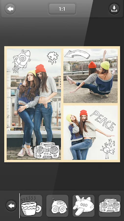 Enhance your collages with funny stickers, eye catching backgrounds and photo filters.