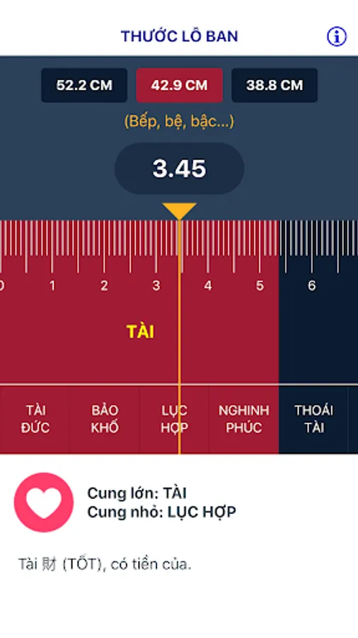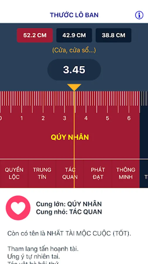 Lu Ban Ruler helps you to choose a good size for interior furniture, construction size such as checking cabinet size, altar, door size, window ... Application has an intuitive interface , quickly give complete information about good and bad properties in different sizes.