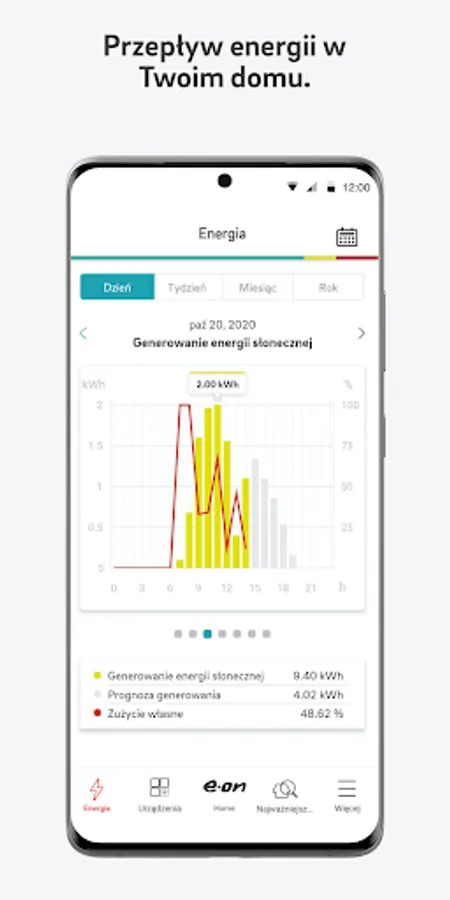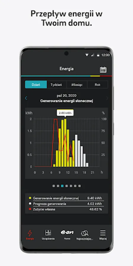Based on data from PV installations and energy storage, E.ON FOTON Home shows not only how much energy you generate or store, but also much more interesting information. Thanks to the application you will see, among others the efficiency of your PV system or you will check to what extent your house is energy self-sufficient.