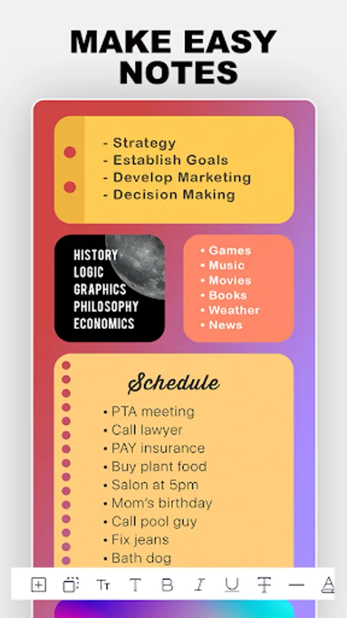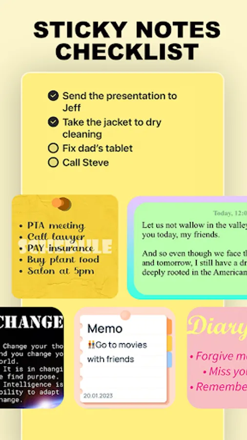 - Write various types of notes, such as class notes, book notes, sticky notes, and text notes.