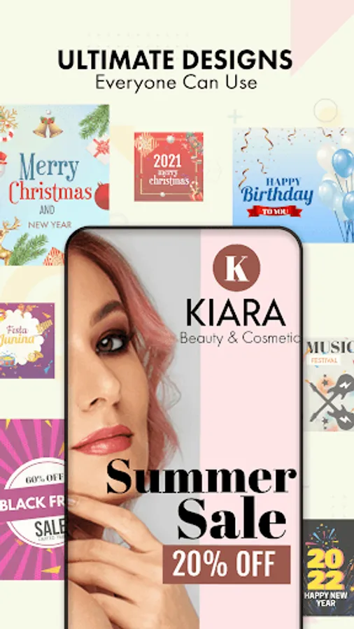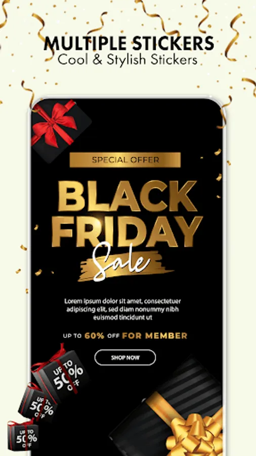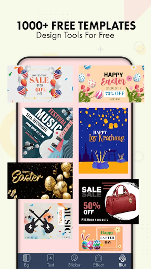 Create promotional posters, advertisement, offer announcements, cover photos on the go with amazing backgrounds, texture, effects, fonts, sticker and get the attention you want.