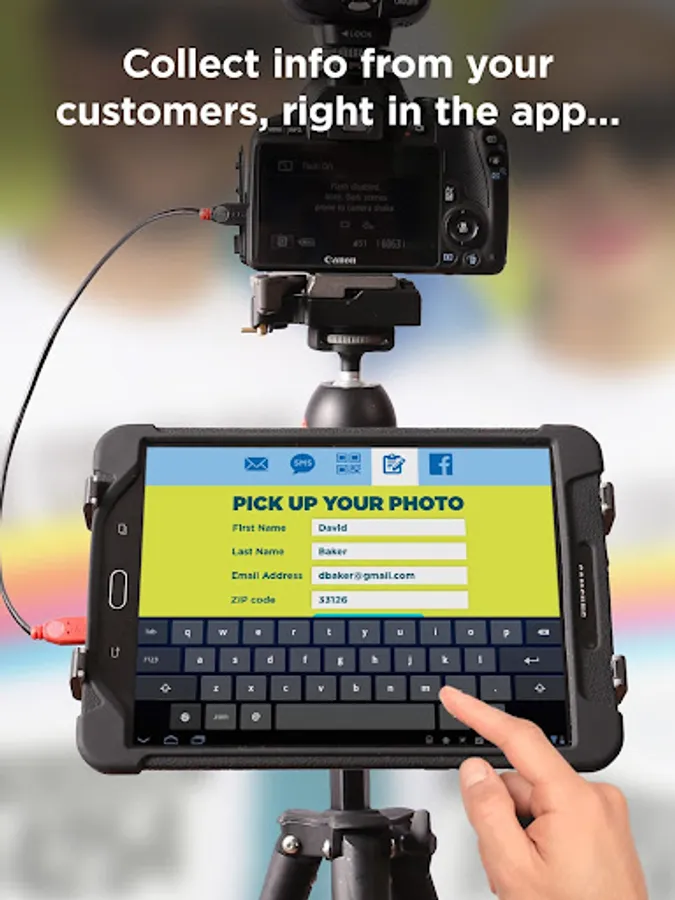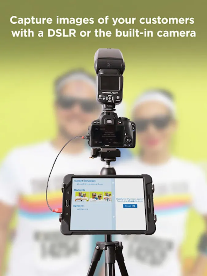 Capture photos, GIFs and videos of your customers and event guests. Instantly deliver the branded images to the guests, ready for sharing. Use the camera built into your Android device or connect a DSLR camera with an OTG cable.
