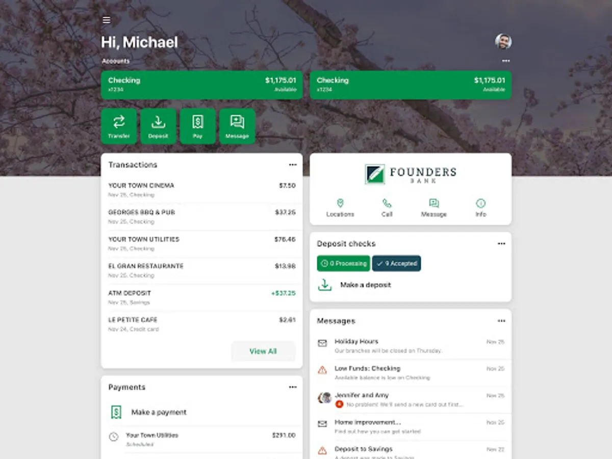 Founders Bank Personal is your personal financial advocate that gives you the ability to aggregate all of your financial accounts, including accounts from other banks and credit unions, into a single view. It’s fast, secure and makes life easier by empowering you with the tools you need to manage your finances.