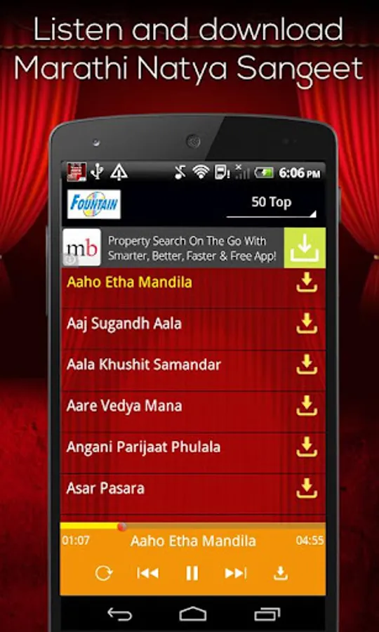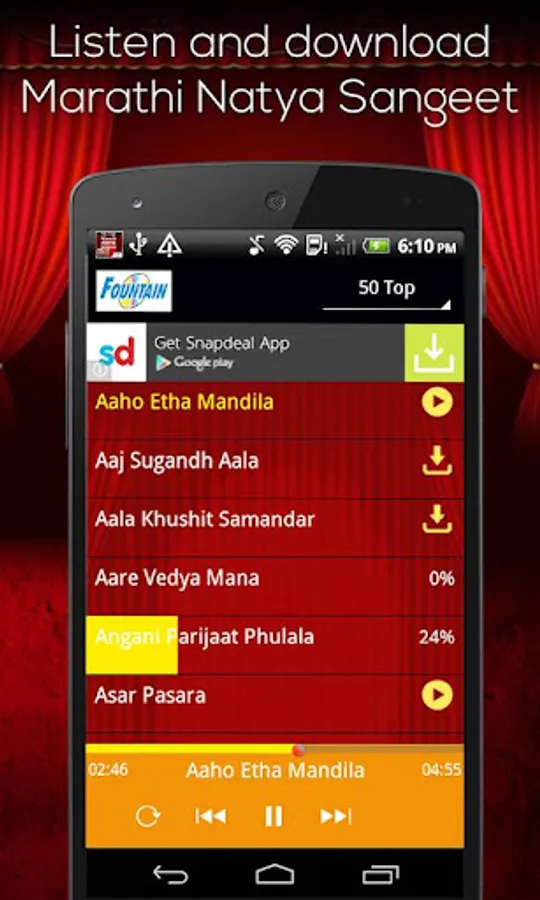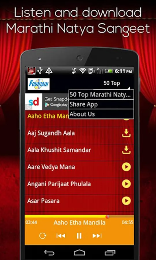 Marathi Natya Sangeet, Classical songs from Marathi Dramas (Natak), Dramatic Music and the musical dramas. Natya Sangeet or Natyasangit is a form of Indian classical and semi-classical music. The roots of natya sangeet can be found in western part of India, especially in Maharashtra. These dramatic songs used to be the part of the drama or in some cases, the entire drama used to be in the form of songs or Natya Geete. 50 Top Marathi Natya Sangeet handpicked for you to give you an excellent Marathi classical collection of songs. Just click on any track to play for FREE or download any track you would like.