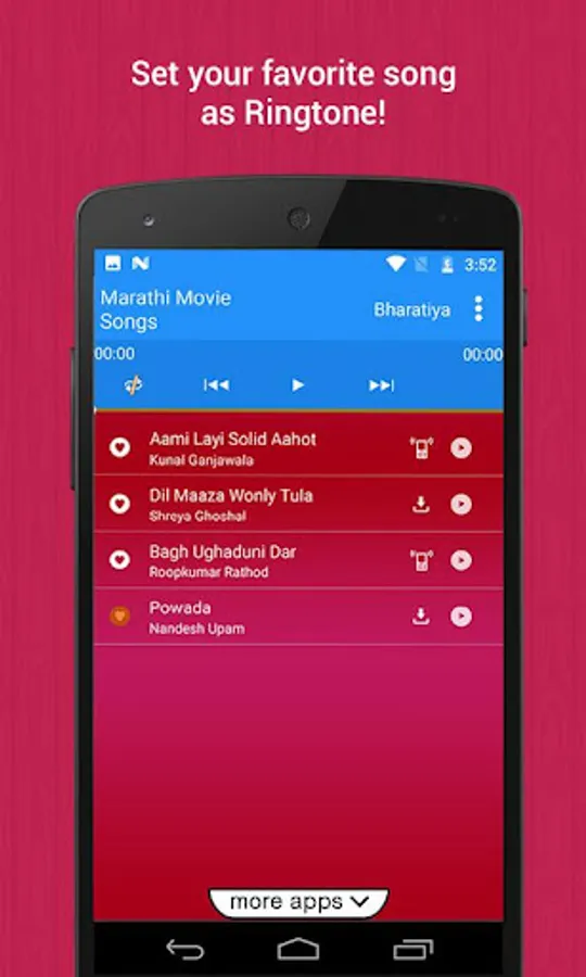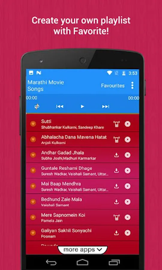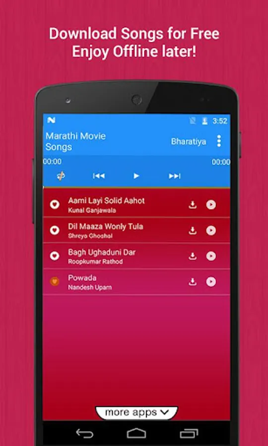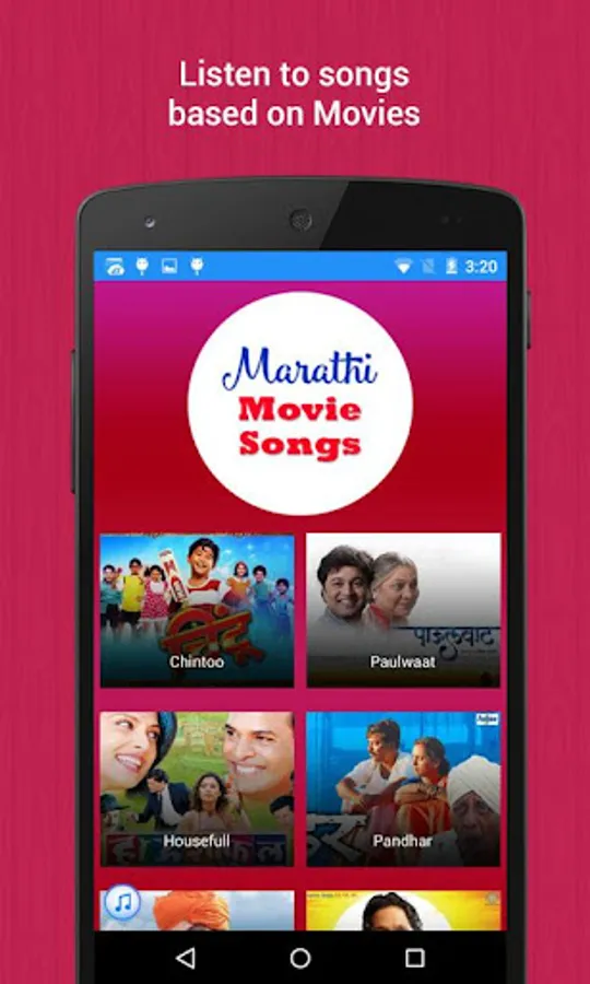 Listen to the latest marathi songs directly through your mobile phone any time and any where. Fountain Music and Winjit Technologies gets you the app with collection of latest and famous Marathi movie songs. You can discover the wide collection of Marathi movie Songs by various artists like Sandeep Khare, Vaishali Samant, Poonam and many more all in one app. Moreover, you can enjoy this serene collection on 2G/3G and Wifi as well. So download this app now.
