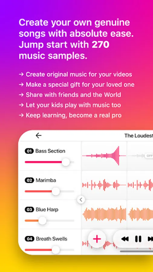 4Beats — the absolutely easiest and powerful way to create your own genuine songs, anytime, anywhere. Start for FREE with 270 complimentary music samples, created by professional musicians. Go on, discover your talent for music!
