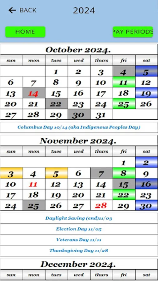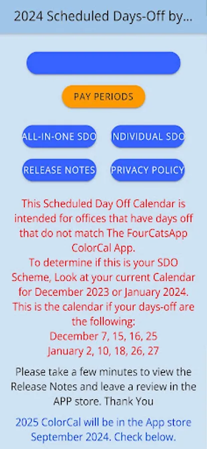 This calendar intended for USPS employees with Sunday / Rotating day-off schedules whose SDO color scheme does not match the FourCatsApp ColorCal scheme