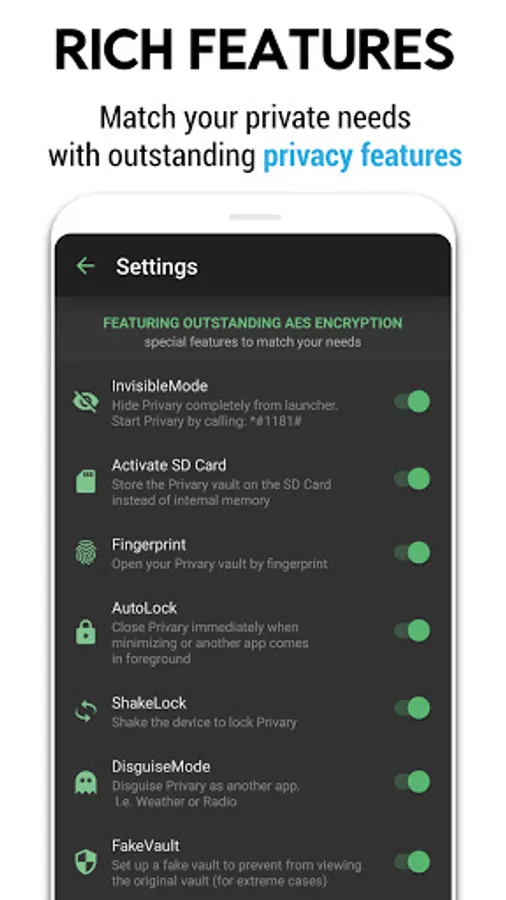 Chose if you want to disguise Privary from your apps list. Or open a decoy Fake Vault to stay protected when someone forces you to open your Private Vault.