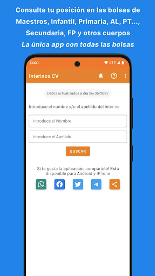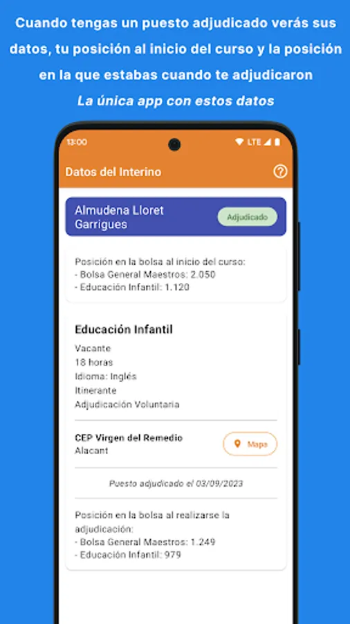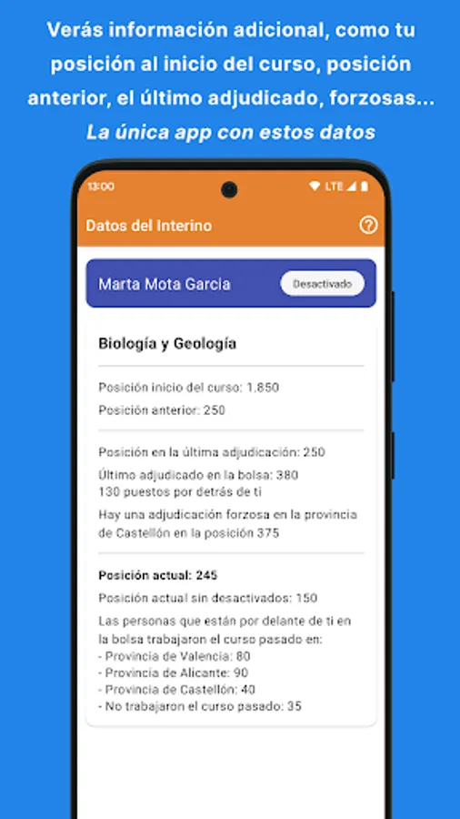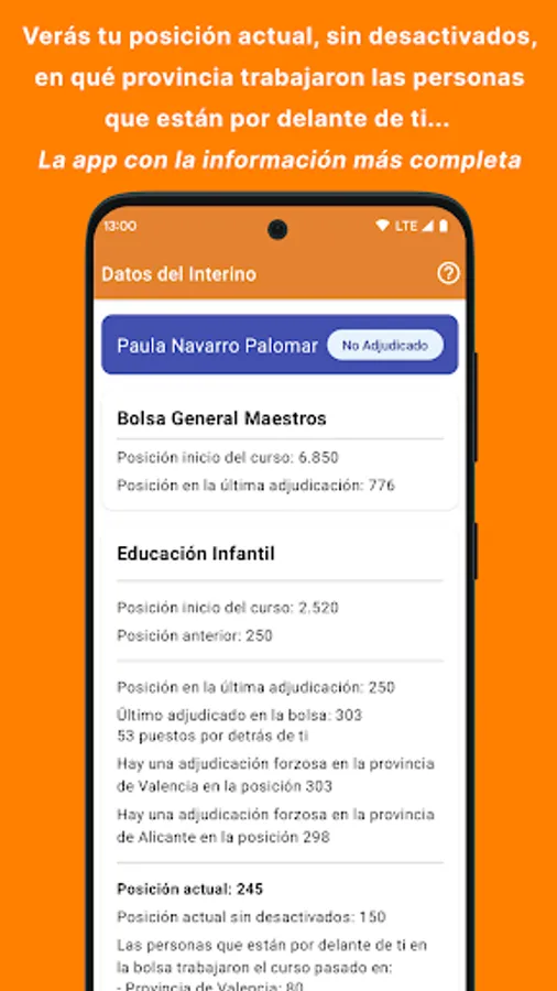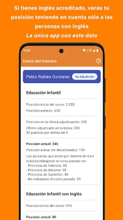 The lists are unique and it is difficult to know how many people in your specialty are ahead of you. The InterinosCV app shows you your real position in ALL the Ministry's exchanges including the Early Childhood Education, Primary Education, Secondary Education, Vocational Training, Therapeutic Pedagogy, Hearing and Language, Official Language Schools, Music Teachers and Professors, Plastic Arts Workshop Teachers and Teachers, etc.