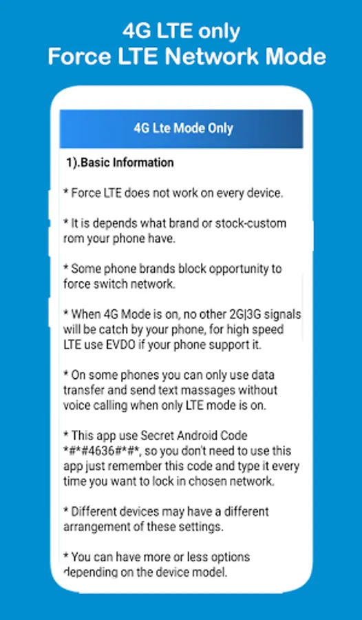 Note : 4G LTE Only not working on every phone. Some phone brands block opportunity to force switch network.