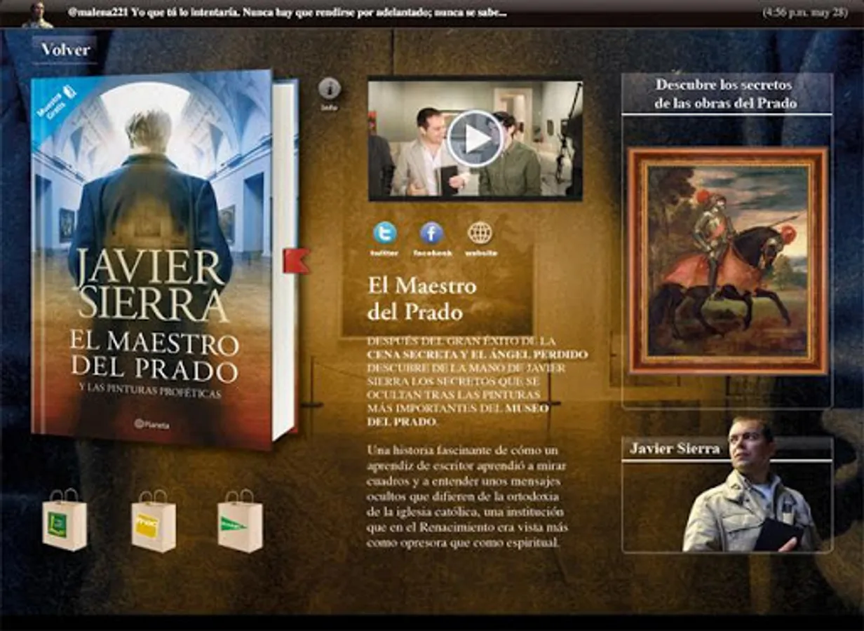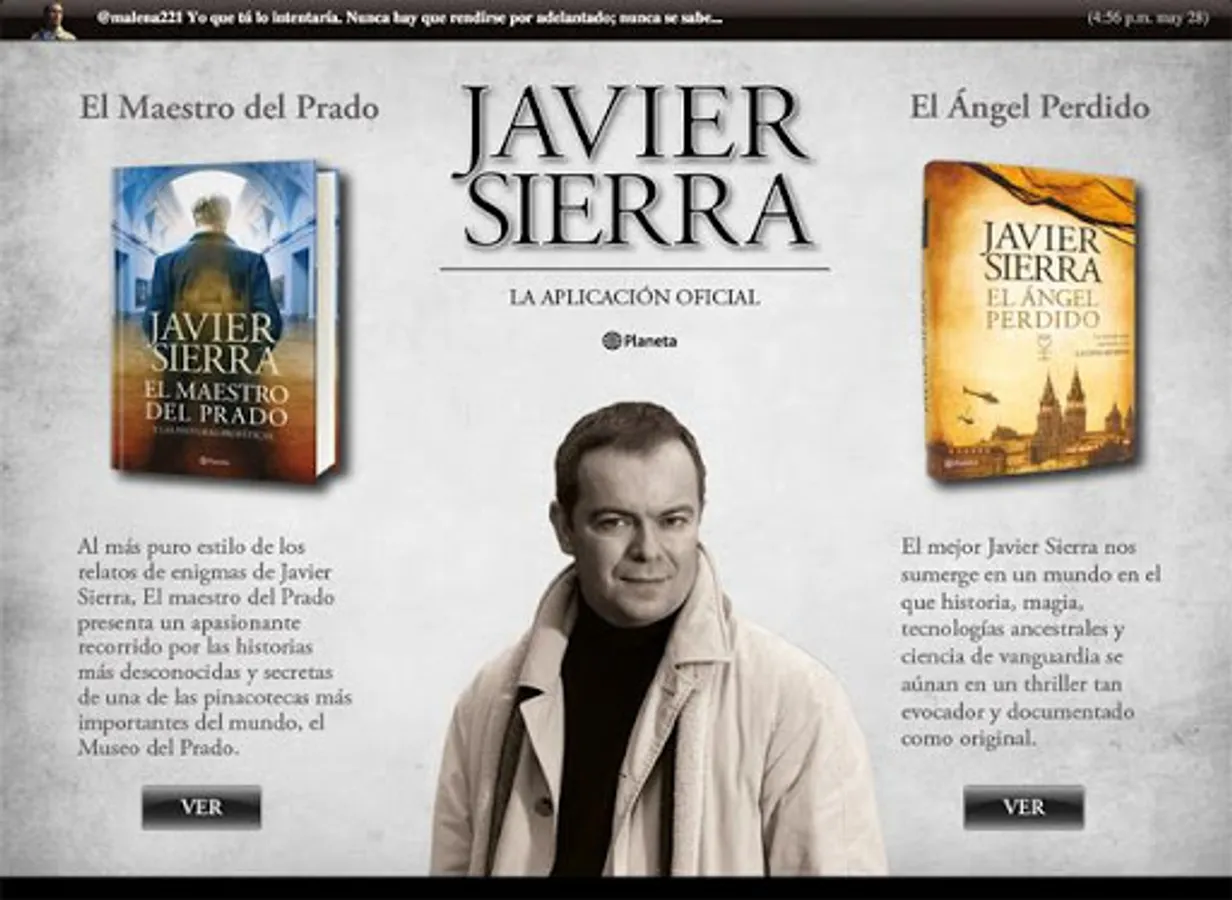 Learn in depth all the details and curiosities of 'The Master of the Prado' and 'The lost angel', the last two novels by Javier Sierra. This application offers unknown details of the creation process of this prestigious writer. It is, ultimately, a different way to get into the narrative process of the hand of the author and with a lot of information that makes the result even more exciting novels if possible. The application includes links to major online stores to buy the novels and receive at home, Biography of Javier Sierra and shows the writer's activity on social networks.