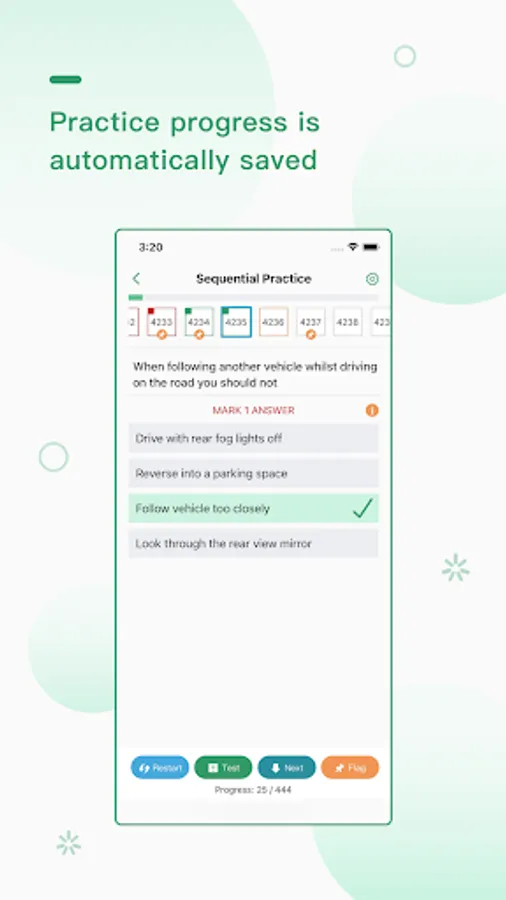 • Practice progress is automatically saved