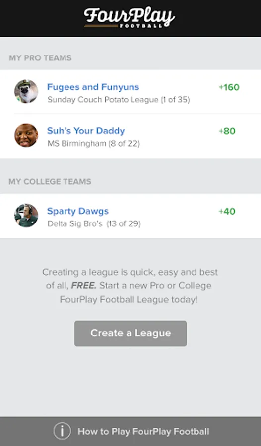 Our underground leagues have existed for decades, but the manual administration was time consuming and cumbersome. With the FourPlay App, now YOU can form Private Leagues to compete with your friends in both our College and Pro League formats in a thrilling season-long battle!
