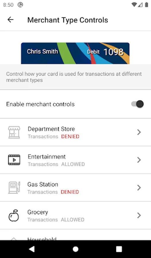 Spending limits can be established to allow transactions up to a certain dollar value and decline transactions when amounts exceed your defined thresholds. Transactions can be monitored and managed for specific merchant categories such as gas stations, department stores, restaurants entertainment, travel, and groceries. And your transactions can also be monitored for specific transaction types: in-store purchases, e-commerce transactions, mail/phone orders and ATM transactions.