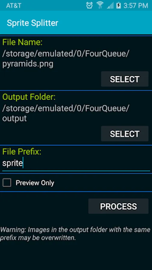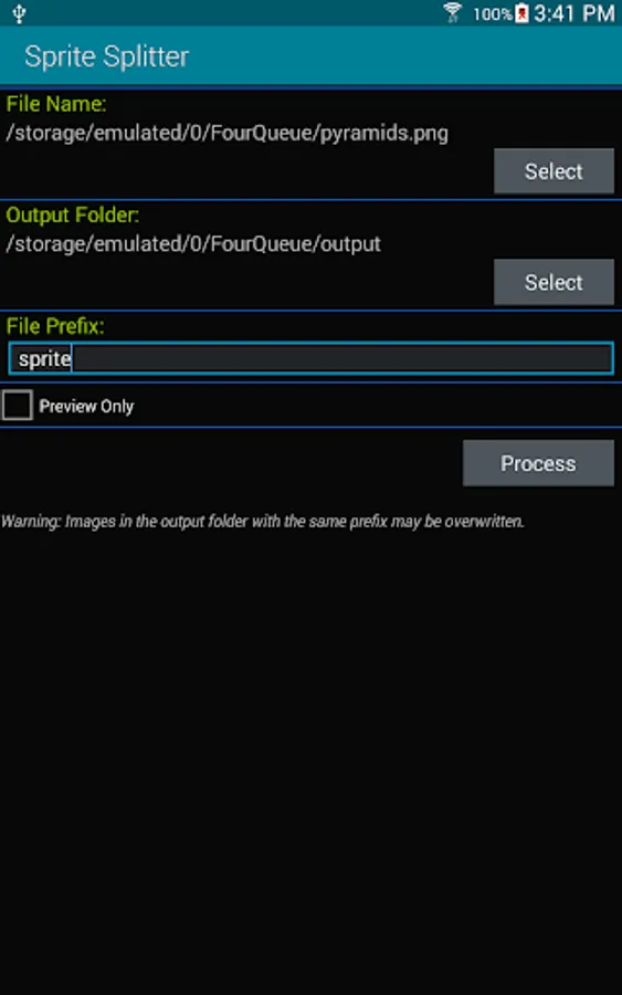 The application will scale the image to the screen for viewing the progress during execution. It will draw a red rectangle around each sprite for viewer feedback. It will not change the original file.