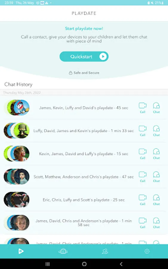 Parents can see recordings of Playdate sessions immediately to check for inappropriate content or just take part in their Kids' fun!