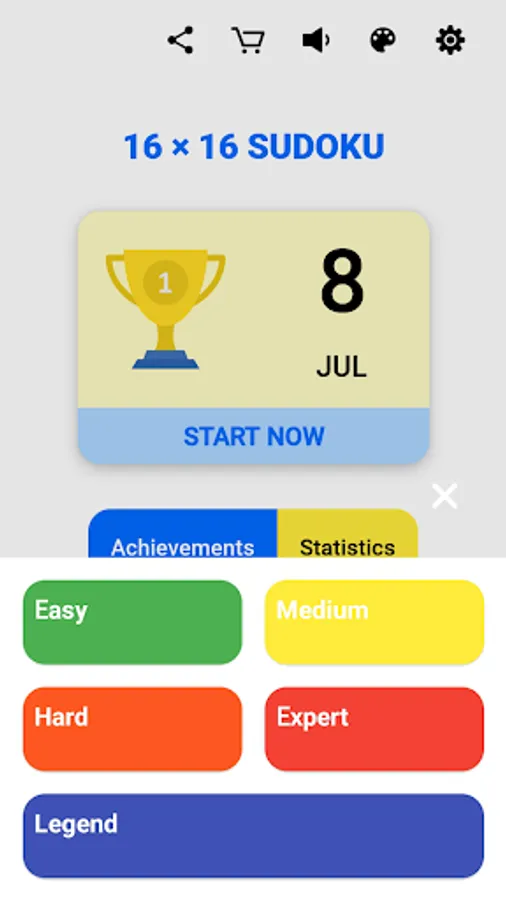 Also, this app has a robust mechanism to track your achievements and statistics. It involves following for all levels of 16x16 giant Sudoku puzzle,