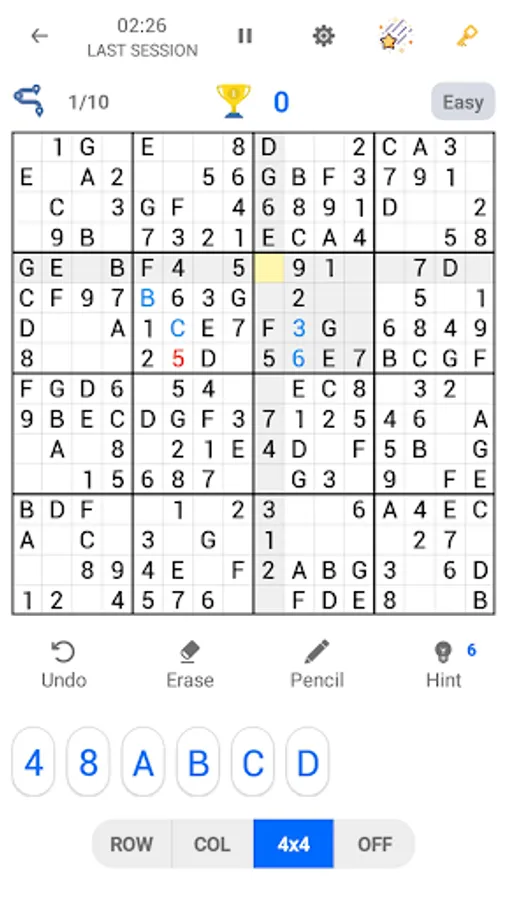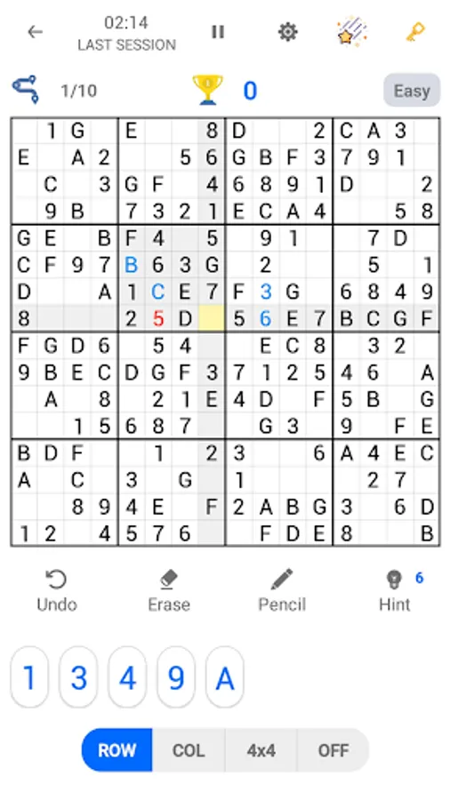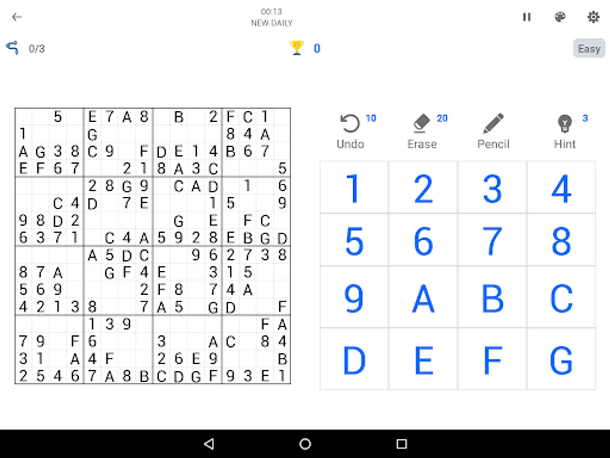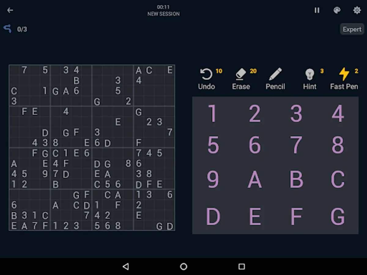 16x16 Sudoku is a puzzle consists of 1 to 9 digits and A to G alphabets. Each Sudoku has only one solution. This Mind Sharper Classic 16x16 Sudoku is for your brain, logical thinking, and memory power. It’s a TIME KILLER game.