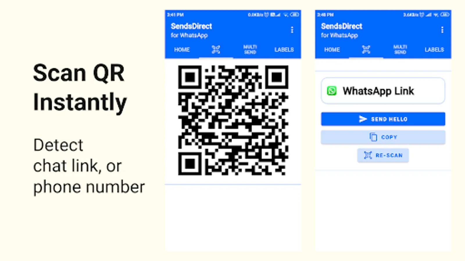 In addition to the above, we also provide the QR code scanner, in case, you end up with a QR code of either WhatsApp contact link or phone number, you just need to scan it and tap on "Send" button. You can also copy the scanned value, if you want.