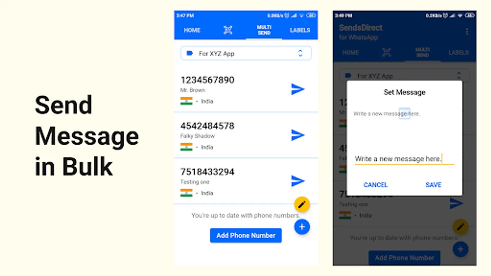 To send the same direct message to bulk contacts, you simply have to select label to fetch all phone contacts associated with selected label, and then click on the "Pencil" icon to set message, and then click "Send Arrow" placed just next to each phone number.